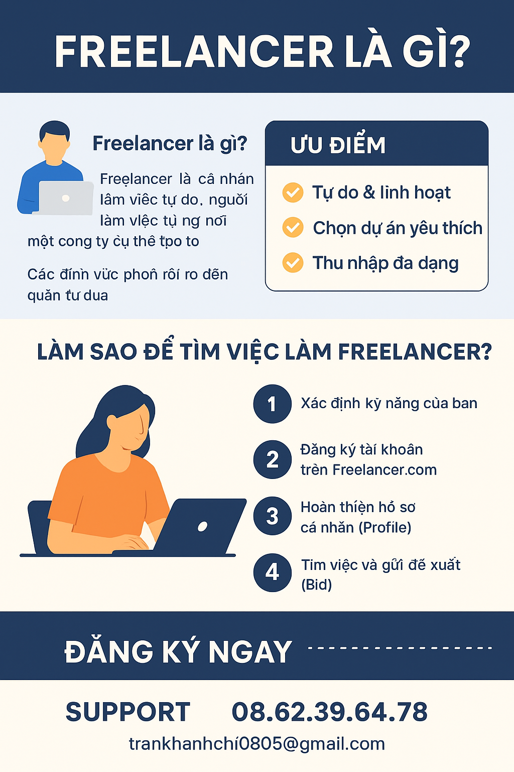 Trong thời đại công nghệ số, freelancer (người làm việc tự do) đang trở thành xu hướng nghề nghiệp phổ biến. Thay vì ràng buộc với một công ty, freelancer có thể làm việc độc lập, chọn dự án yêu thích, và tự chủ về thời gian, thu nhập.